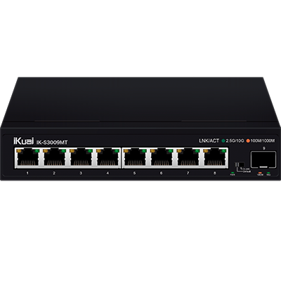 IK-S3009MT是愛快面向小微企業和安防場景的高性價比非網管2.5G接入交換機。IK-S3009MT采用全金屬機身,提供8個10/100/1000/2500Mbps自適應RJ45端口和1個10Gbps上行SFP+端口,所有端口均支持線速轉發及MDI/MDIX自動翻轉功能,無需配置,即插即用,滿足大多數有線、無線以及監控等各種接入場景使用需求。